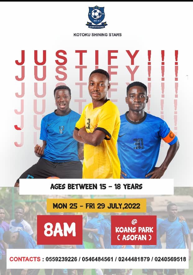Ghanaian Division two (2) side Kotoku Shining Stars will hold a four -day Justify -your-inclusion at Accra Asofan koans park from Monday 25th July 2022 to Friday 29th July 2022 .